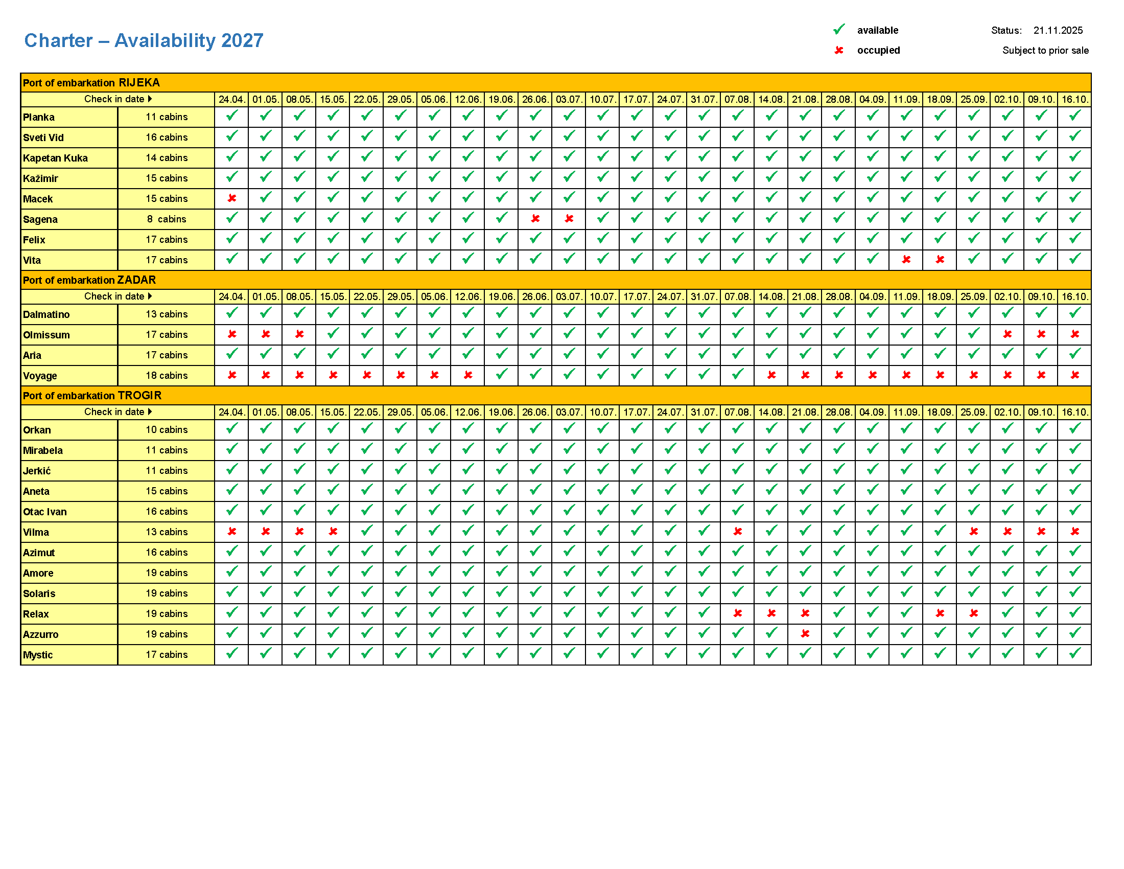 Generally, embarkation and disembarkation take place at the same port. However, there is the possibility to choose different ports for embarkation and disembarkation (for example, Rijeka and Zadar), if you charter the boat for two or more groups in a row. For example, two times seven days, or two short cruises of three and four days.
