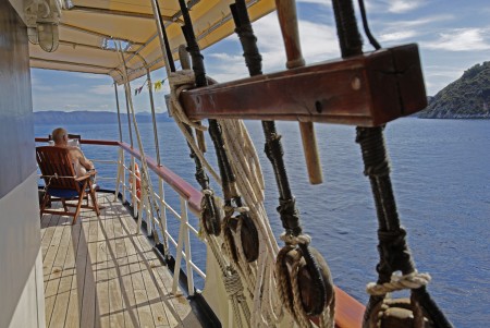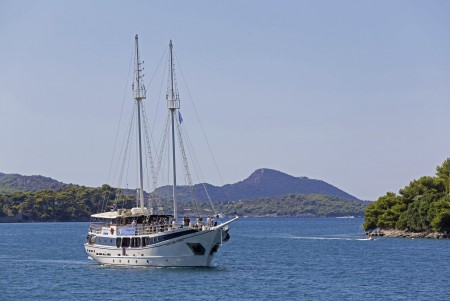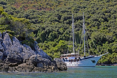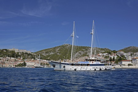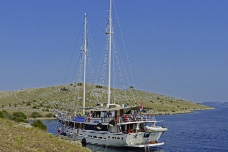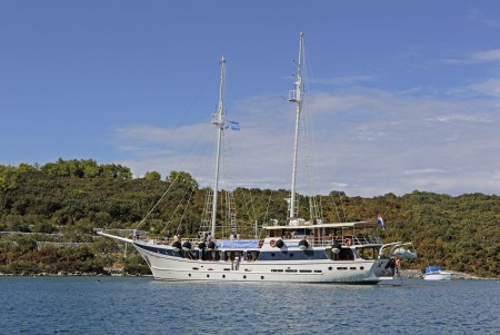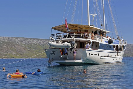 Named after the famous movie character “Captain Hook”, this marvelous steel-hull vessel is fortunately not commanded by pirates, but by Captain Pero Kalebić from the small island of Šolta. Captain Pero and his former boat “Zelenbor” used to be part of our fleet for many years. In summer of 2015, the Kalebić family decided to buy a new vessel and to celebrate their comeback. Before the 2016 cruise season started, the Kapetan Kuka went through an overhauling process including renovation of all cabins. Furthermore, a bathing platform with showers has been installed at the stern. By the way, Pero speaks good English, and German as well, because his wife Sylvia came aboard the Zelenbor as a German holidaymaker in 1981, and has been living with Pero on the island of Šolta for more than 40 years now.