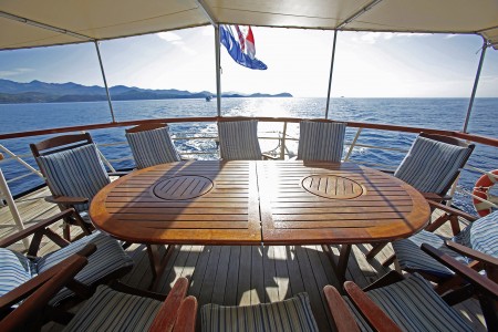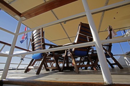 Other: Sun deck (150 m²) with 16 lounger mattresses and 16 deck chairs, table with 10 chairs in the covered area at the stern of the upper deck. Tables with benches and chairs for 15-20 guests on the covered main deck right behind the saloon, bathing platform with showers at the stern, air-conditioned saloon for 34 guests including a small lounge area.