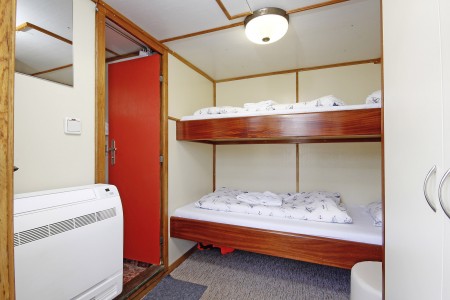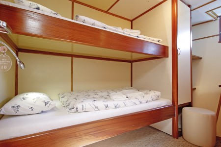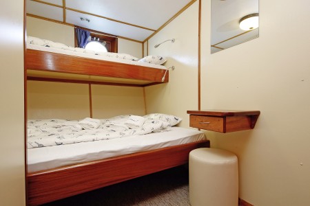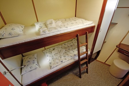 Main deck: 1 twin cabin with bunk beds, 1 family cabin with bunk beds (= 2 twin cabins sharing one shower/toilet).