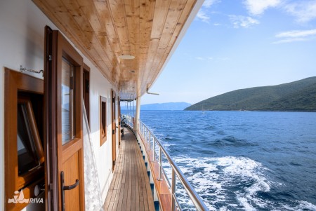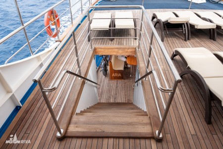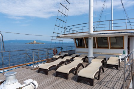 Other: Two sun decks (290 m² in total) with 36 sun loungers and reefable awnings, tables with benches and chairs for 36 people on the covered main deck right behind the saloon, bathing platform with showers at the stern, air conditioned saloon for 36 guests.