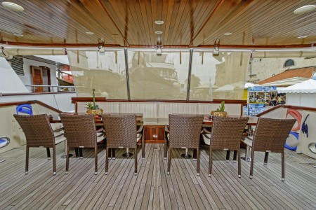 Other: Sun deck (200 m²) with 16 deck chairs and 10 lounger mattresses, tables with benches or chairs on deck for 16 persons (main deck) and 12 persons (upper deck), bathing platform with showers at the stern, saloon with air conditioning for 28 guests.