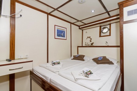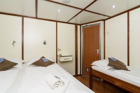 Lower deck: 2 double cabins with queen-size bed, 2 triple cabins with queen-size bed and separate 3rd bed.