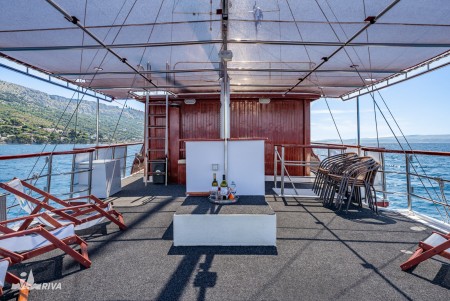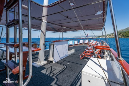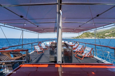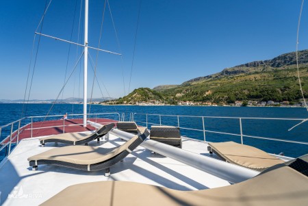 Other: Sun deck (100 m²) with 14 deck chairs, 2 tables with benches on deck for 18 guests, saloon with air conditioning for 26 guests.
