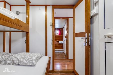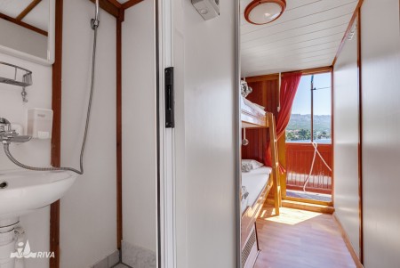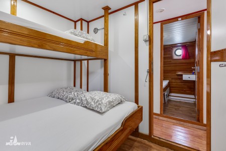 Main deck: 2 twin cabins with bunk beds, 4 triple cabins with queen-size bed and 3rd bed above.