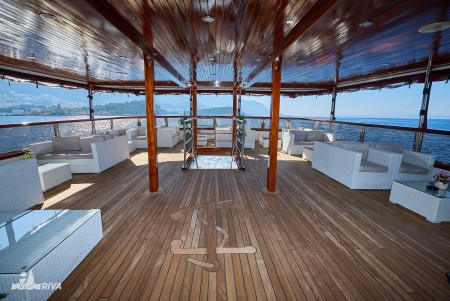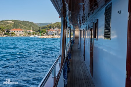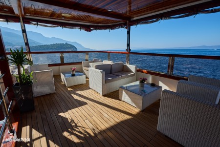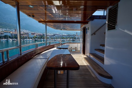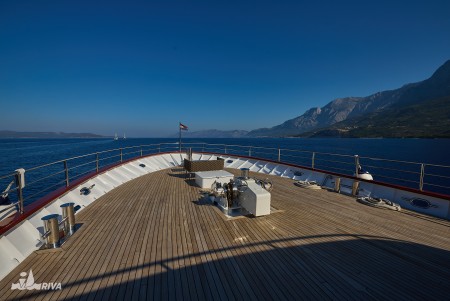 Other: Sun deck (220 m²) with 40 sun loungers, bathing platform with showers at the stern. Saloon with air conditioning for 40 guests on the upper deck. The saloon opens onto the covered part of the upper deck, which comes with an outdoor lounge area with comfortable seating sets for approx. 30 people. Depending on weather conditions, this part can be closed with a tarpaulin. Cabins are cleaned and towels are changed daily.