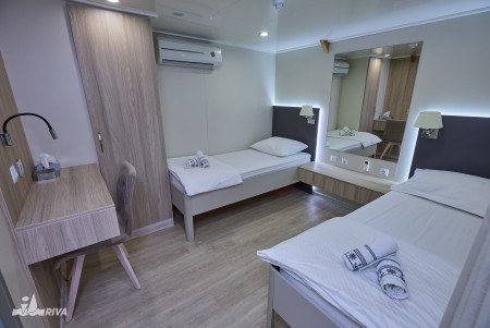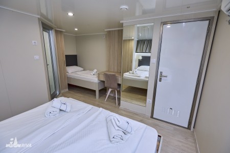 Lower deck: 4 twin cabins with separate beds, 2 double cabins with queen-size bed, 2 triple cabins with queen-size bed and a separate single bed.