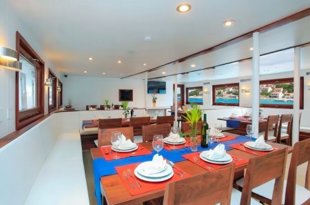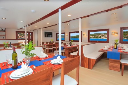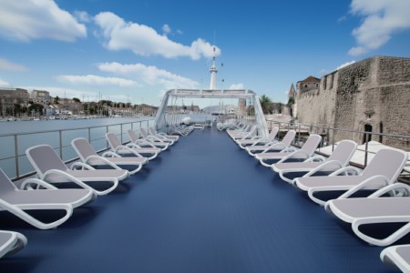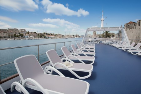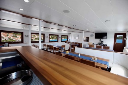 Other: Sun deck (150 m²) with 30 sun loungers, bathing platform at the stern. Air-conditioned saloon for 34 people on the upper deck. Comfortable seating areas.