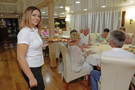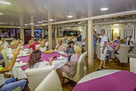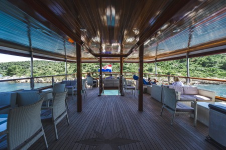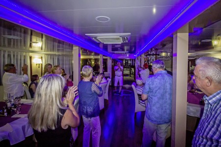 Other: Sun deck (220 m²) with 36 sun loungers, bathing platform with showers at the stern. Saloon with air conditioning for 36 guests on the upper deck. The saloon opens onto the covered part of the upper deck, which comes with an outdoor lounge area including comfortable seating sets for approx. 20 people. Depending on weather conditions, this part can be closed with a tarpaulin. Cabins are cleaned and towels are changed daily.