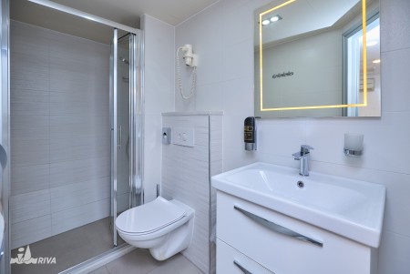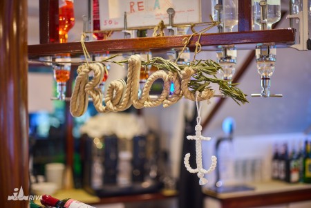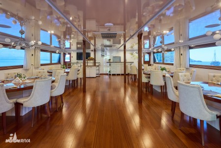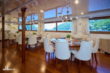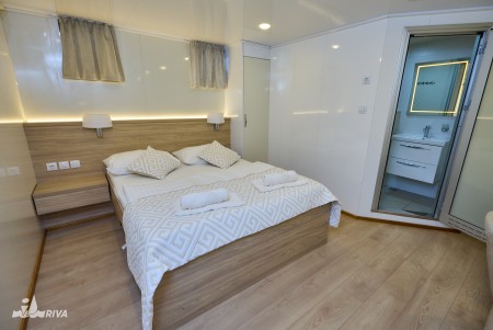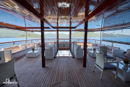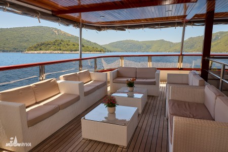 Other: Sun deck (220 m²) with 40 sun loungers, bathing platform with showers at the stern. Saloon with air conditioning for 40 guests on the upper deck. The saloon opens onto the covered part of the upper deck, which comes with an outdoor lounge area with comfortable seating sets for 40 people. Depending on weather conditions, this part can be closed with a tarpaulin. Cabins are cleaned and towels are changed daily.