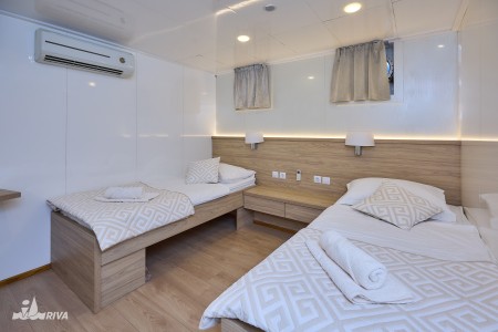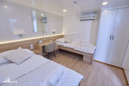 Lower deck: 4 twin cabins with separate beds, 2 double cabins with queen-size bed, 2 triple cabins with queen-size bed and a separate single bed.