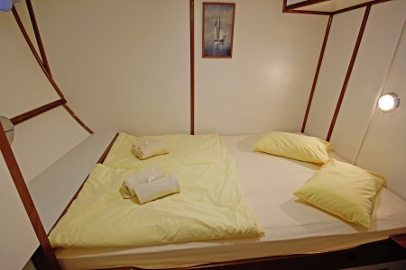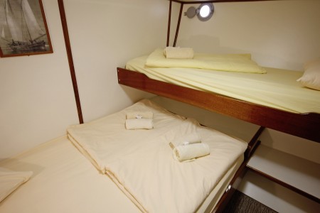 Upper deck: 1 double cabin with queen-size bed, 1 triple cabin with queen-size bed and 3rd bed above.