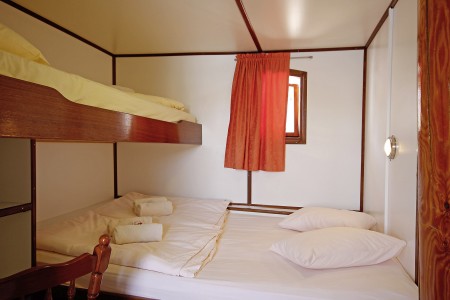 Lower deck: 1 double cabin with queen-size bed, 1 triple cabin with queen-size bed and 3rd bed above, 2 twin cabins with separate beds.