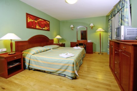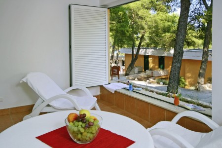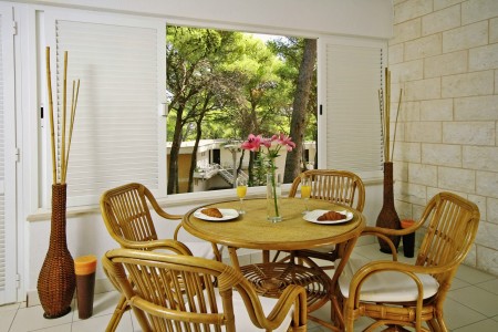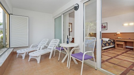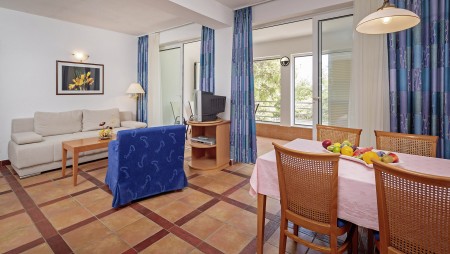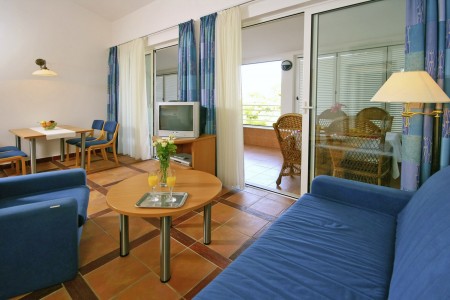 Deluxe apartment for 4-6 persons: approx. 71 m², one bedroom with double bed, one bedroom with single beds, living/bedroom with sofa bed (200 x 170 cm), kitchenette with microwave and dining area, telephone, satellite TV, DVD player, air conditioning, bath/shower/WC, loggia with chairs facing the park.