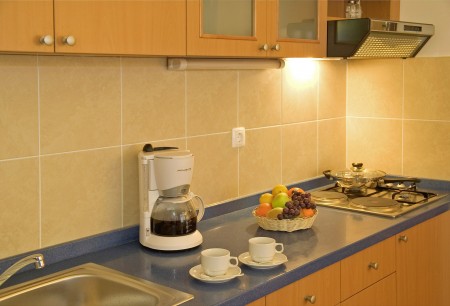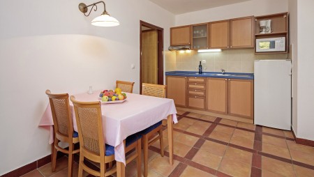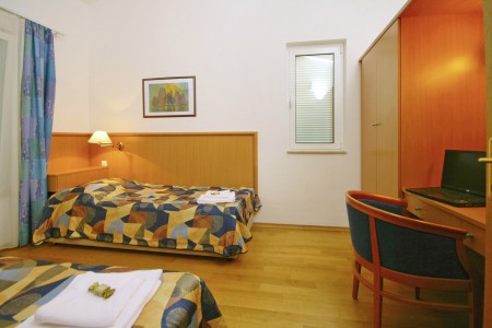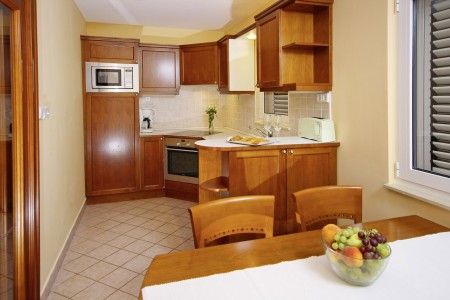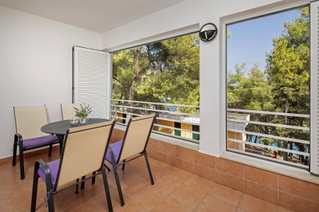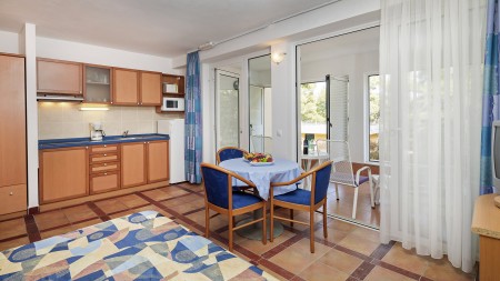 Deluxe apartment for 2-4 people: approx. 68 m², one double room, living room/bedroom with sofa bed (200 x 130 cm), fully equipped kitchen with oven, hotplates and microwave, dining area, telephone, satellite TV, DVD player, air conditioning, bath/shower/WC with washing machine, loggia with chairs facing the park.
