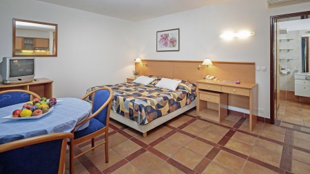 Deluxe studio for 2 people: approx. 37 m², living room/bedroom with double bed, kitchenette (with coffee machine and microwave) and dining area, telephone, satellite TV, DVD player, air conditioning, shower/WC, loggia with loungers facing the park.