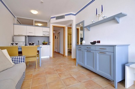 Apartment type D for 4-6 persons: approx. 45 m², entrance area with double bed or bunk bed, one bedroom with double bed, living/sleeping room with double sofa bed, kitchenette, dining area, air conditioning, satellite TV, safe, WiFi internet (free of charge), shower/WC, balcony or terrace. Optionally also bookable with sea view.
