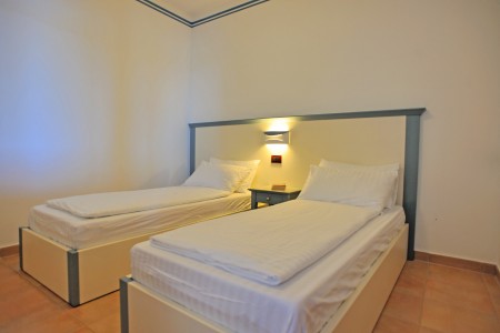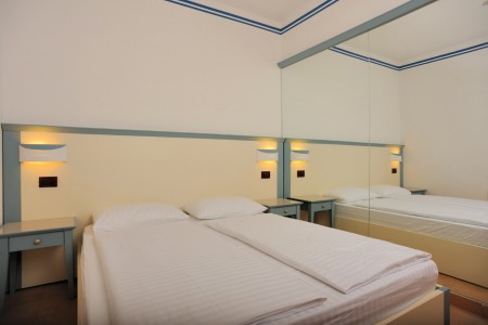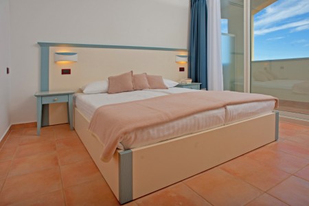 Apartment type E for 4-6 persons: approx. 50 m², one bedroom with double bed, one bedroom with two single beds or bunk beds, living room/bedroom with double sofa bed, kitchenette, dining area, air conditioning, satellite TV, safe, WiFi internet (free of charge), two showers/WC, balcony or terrace with sea view.