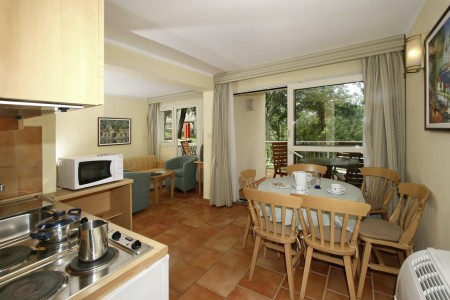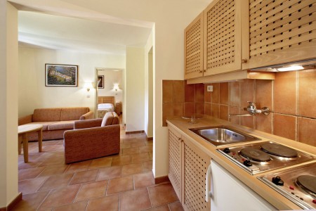 Apartment for 4-5 people type 1: modern furnishings, approx. 35-44 m², two double rooms, living room/bedroom with sofa bed, air conditioning, satellite TV, telephone, WiFi internet (free of charge), safe for a fee, kitchenette with microwave and dining area, shower/WC, balcony or terrace. Baby crib available free of charge on request.
