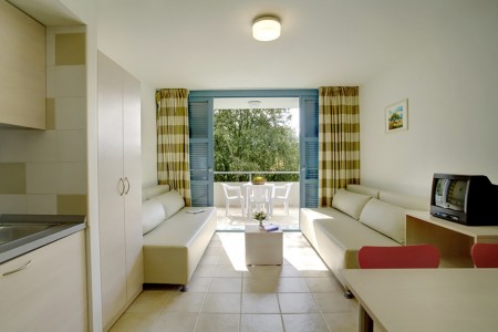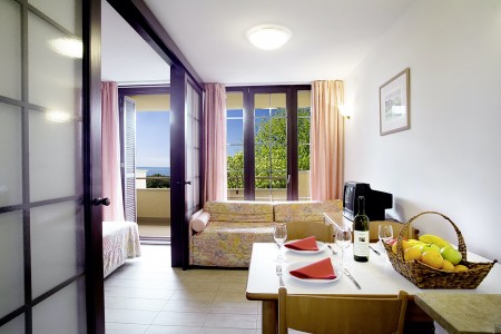 Standard apartment for 2-4 people: approx. 44 m², one double room, living room with two beds, satellite TV, kitchenette (separated from the living area by a shelf) and dining area, shower/WC, balcony facing the sea.