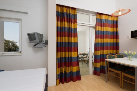 Apartment for 2-4 persons: approx. 45 m², one double room, living room with sofa bed (140x180 cm), kitchenette and dining area, bath or shower/WC, balcony.