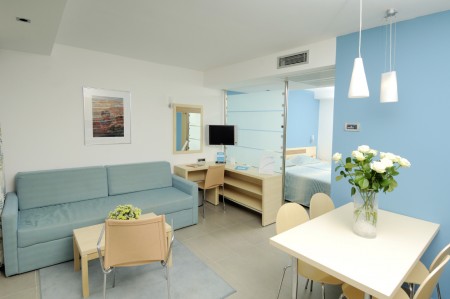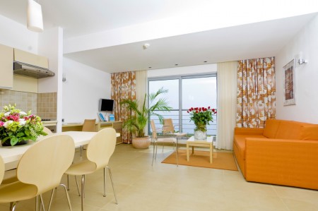 Apartment for 2-3 persons type B: approx. 30-38 m², one bedroom with two single beds (100x200 cm each) and living room with sofa bed (160x200 cm), air conditioning, satellite TV, telephone, WiFi internet (free of charge), safe, kitchenette with microwave and coffee machine, dining area, shower/WC, balcony. Located in the first row to the sea.