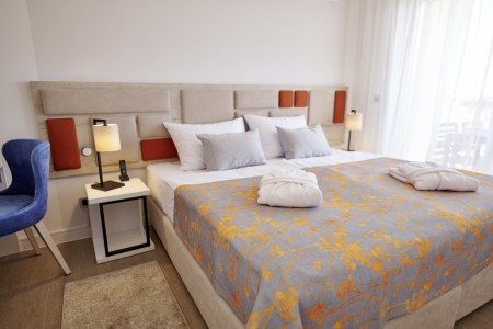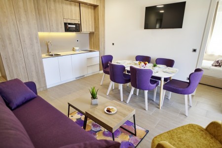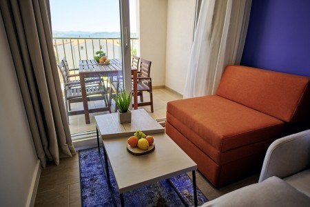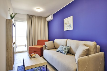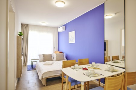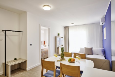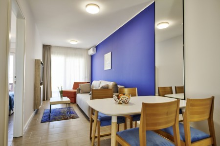 Apartment for 2-4 people: approx. 43 m², one bedroom with double bed, double sofa bed in the living area, air conditioning, flat-screen satellite TV, kitchenette with fridge, microwave, capsule coffee machine (3 capsules free of charge) and kettle, dining area, safe, telephone, WiFi internet (free of charge), shower/WC and hairdryer, balcony. Baby crib available on request (for a fee, €15 per night). Optionally also bookable with sea view.