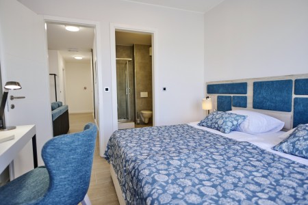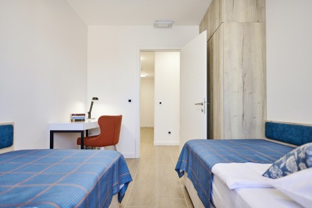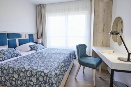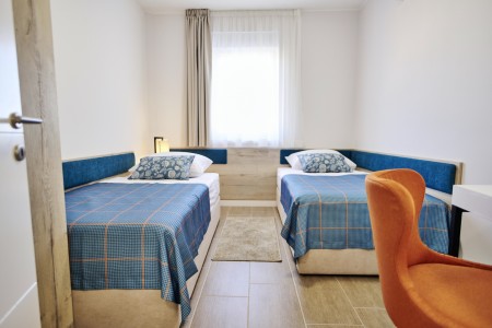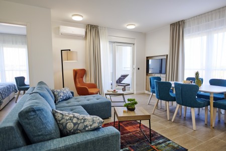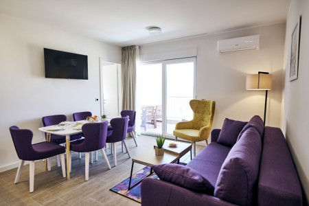 Apartment for 4-6 persons: approx. 67 m², one bedroom with double bed, one bedroom with two single beds, double sofa bed in the living area, air conditioning, flat-screen satellite TV, kitchenette with fridge, microwave, capsule coffee machine (3 capsules free of charge) and kettle, dining area, safe, telephone, WiFi internet (free of charge), two bathrooms with shower/WC and hairdryer, balcony. Baby crib available on request (for a fee, €15 per night). Optionally also bookable with sea view.