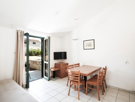 Apartment "Essential" for 4-5 people: approx. 35 m² on the first floor, two double rooms, living room with sofa bed (75x195 cm), kitchenette and dining area, shower/WC, terrace.