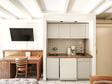 Studio "Essential" for 2 people: approx. 20 m² on the first floor, living room/bedroom with double bed, kitchenette and dining area, shower/WC, terrace.