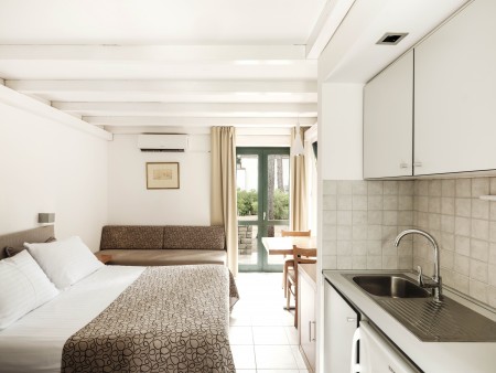 All studios and apartments are equipped with telephone, WiFi internet (free of charge), satellite TV, air conditioning, coffee machine, safe and seating on the balcony or terrace.