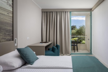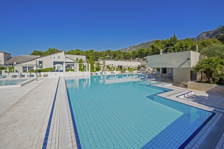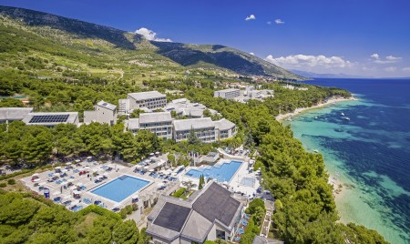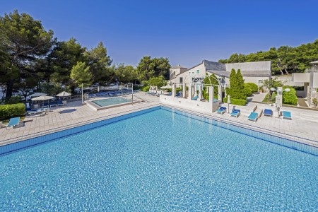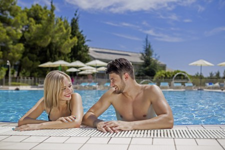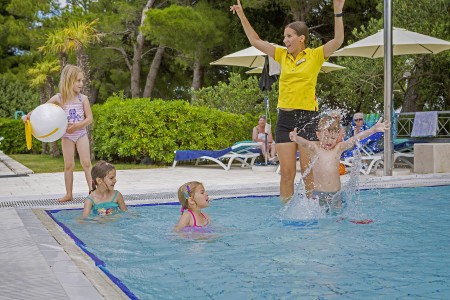 Facilities: Restaurant, lobby bar, specialty restaurants "Komin" and "Konoba" (open seasonally), pizzeria (open from May to September), café, kiosk, seminar rooms, dancing club. Freshwater swimming pool with water slide and separate children's pool, heated relaxation pool, sun terrace, pool bar, sun loungers and parasols (included, limited number), pool towels (included, deposit required). In July and August, extensive entertainment program for children and teenagers in various age groups with pool parties, sports Olympics and much more. Unguarded parking spaces on the hotel grounds. Two charging stations for electric cars (chargeable) available. Internet corner available at the reception/lobby (free of charge), WiFi Internet available in the reception area, lobby bar and at the swimming pool (free of charge).