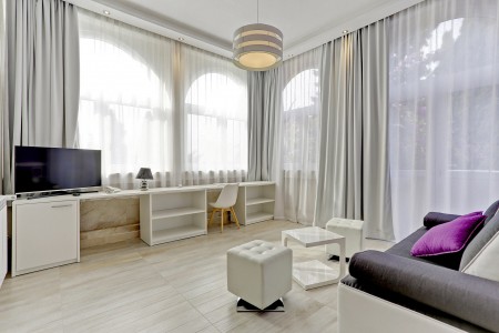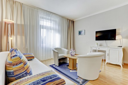 Suites: approx. 35-40 m², consisting of a double room with separate living room with sofa bed and a shared bathroom, balcony. Optionally bookable on the park or sea side.