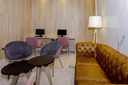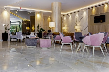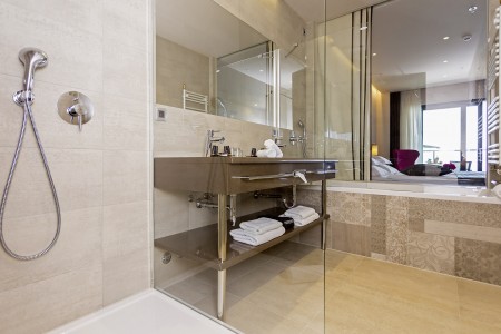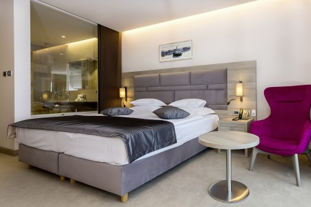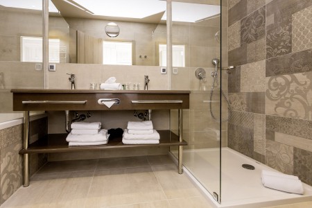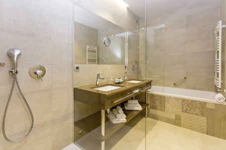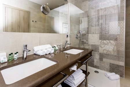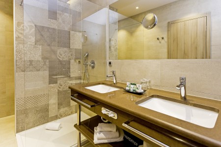 103 rooms: elegant, modern and very comfortably furnished with carpeting, air conditioning, LED SAT and IP TV, telephone, WiFi Internet (free of charge), safe, minibar, desk, coffee and tea making facilities, bathroom with two washbasins, bathtub and shower, separate WC and hairdryer. Bathrobes and slippers are available. Baby crib available on request for a fee (€7 per night).