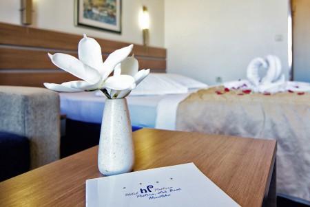 31 rooms: approx. 21-24 m², modern and comfortably furnished with satellite TV, air conditioning, telephone, WiFi Internet (free of charge), minibar, safe, shower/WC and balcony. Optionally bookable on the park or sea side.