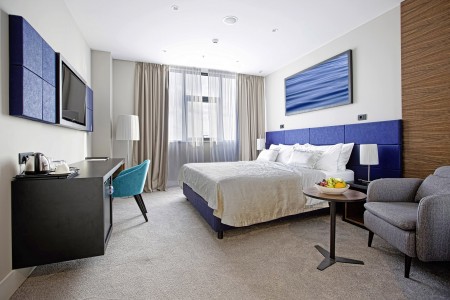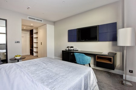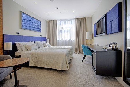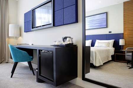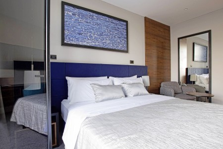 76 rooms: modern and elegantly furnished with double bed, LCD satellite TV, air conditioning, telephone, WiFi Internet (free of charge), safe, minibar, kettle, small desk, bath or shower/WC (with hairdryer). Bathrobes and slippers are provided. Room service from 7-23 h (for a fee). Baby crib available on request (for a fee, € 5 per day).