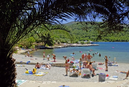 Beach: New, paved pebble beach [Placesbeach] with sunbathing areas and beach bar, surrounded by shady pine trees.