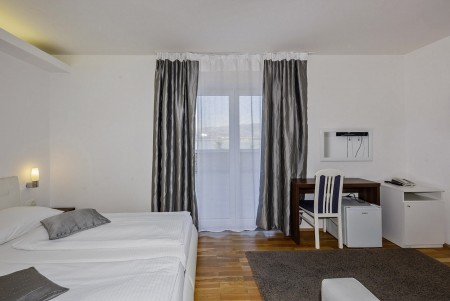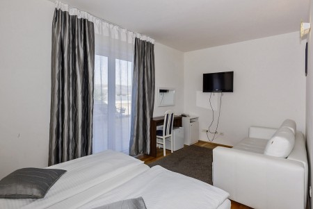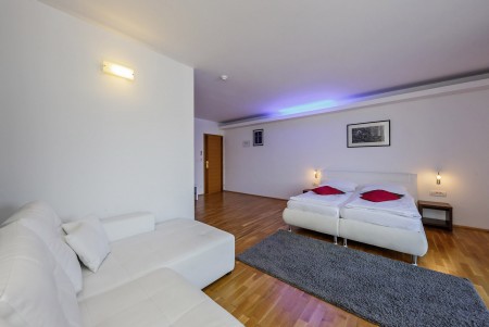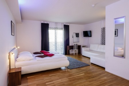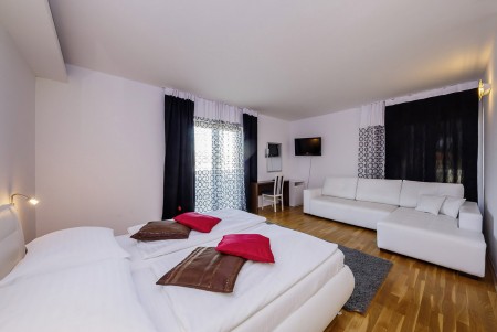 10 apartments: approx. 45 m², consisting of a double room and a living room with double sofa bed, modern and tastefully furnished with air conditioning, telephone, WiFi Internet (free of charge), LED SAT-TV, minibar, safe, bath or shower/WC, balcony or terrace.