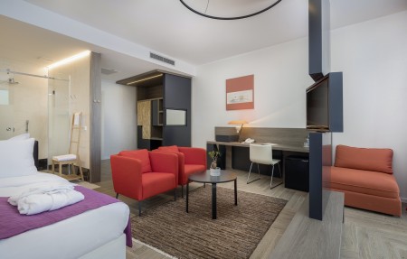 50 rooms: The modern rooms with designer furniture are equipped with individually adjustable air conditioning, desk, safe, telephone, LCD TV, radio, free WiFi internet, open bathroom with underfloor heating and shower/WC, bathrobe, slippers and hairdryer as well as balcony with side or direct sea view. In-room minibar available on request and at an extra charge.