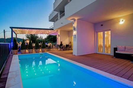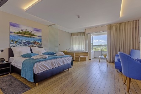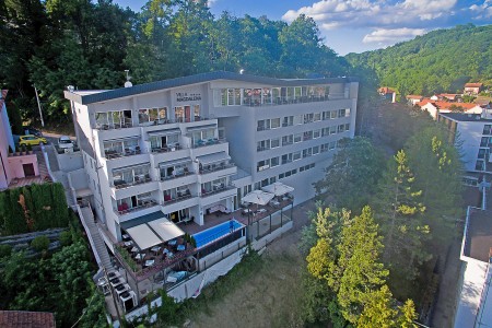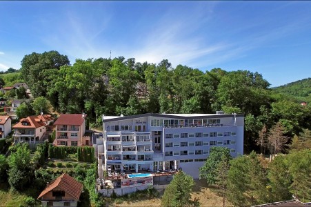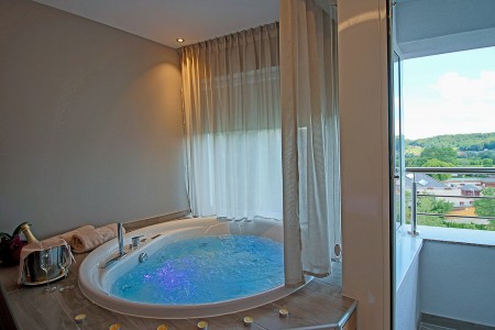 This small, modern hotel is located on a picturesque hill in the center of Krapinske Toplice. Since the time of the Roman Empire, the town has been known for its healing thermal waters, which are among the best in Europe. The location in the middle of the fairytale Croatian Hills (Hrvatsko Zagrorje) is dreamlike. Trakošćan - the most beautiful castle in Croatia is only 35 kilometers away. The enchanting baroque town of Varaždin is 58 kilometers away. Even the capital Zagreb is less than 50 kilometers away. There are also numerous marked cycling and hiking trails in the immediate vicinity. Nearby is the largest and most modern complex of indoor swimming pools with more than 160 water attractions. The special feature of this elegant hotel is the unique service and facilities in the spacious rooms and suites. Each accommodation unit has a jacuzzi in the living room with a direct connection to the thermal water springs of Krapinske Toplice and a beautiful panoramic view of the landscape.