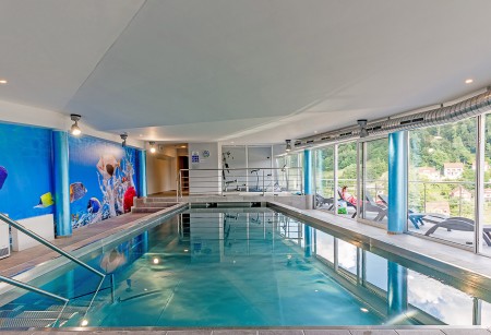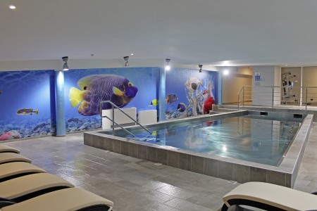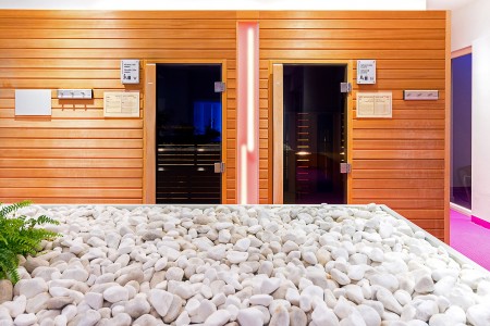 Wellness-Center: The wellness and spa oasis on the top floor (350 m²) with panoramic views offers a small indoor pool, Finnish sauna, flavored bio sauna, infrared sauna, steam bath, whirlpool, drinking fountain and relaxation area with heated benches as well as a fitness center with modern equipment. Use is included for hotel guests. Bathrobes and bath towels for the wellness area are available. Massages and beauty treatments for a fee. The mineralization of the thermal water consists mainly of calcium, magnesium and hydrogen carbonate. Indications include rheumatism, spinal diseases, neurological and muscular diseases, diabetes, diseases of the joints, heart and blood vessels.