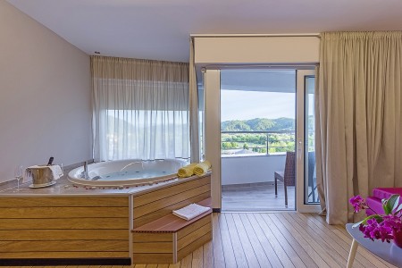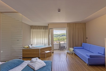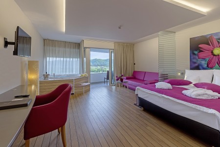 Rooms: All 24 accommodation units are modern and luxuriously furnished and have a whirlpool with color therapy and healing thermal water at 39 ℃ in the living area as well as panoramic views of the surrounding landscape, spacious terrace or loggia, air conditioning, telephone, LCD satellite TV, radio, minibar, safe, intelligent room control, water and tea maker, WiFi Internet (free of charge), desk as well as shower/WC and hairdryer.