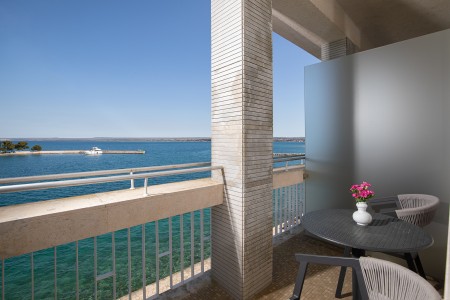 Suite: approx. 50 m², bedroom with double bed, living room with sofa, two bathrooms, one with walk-in shower, the other with bathtub. Balcony with sea view.