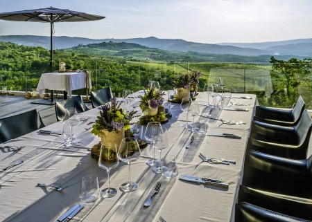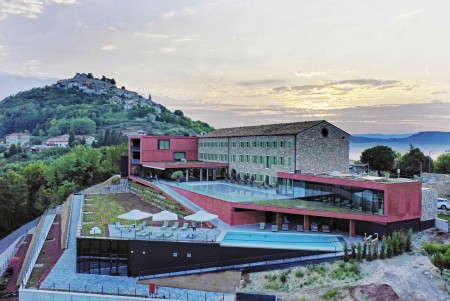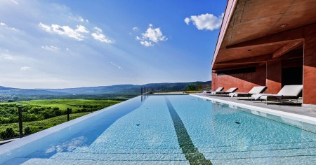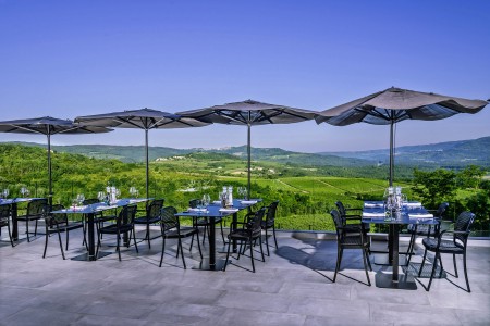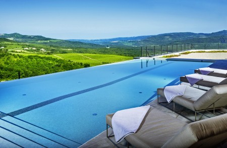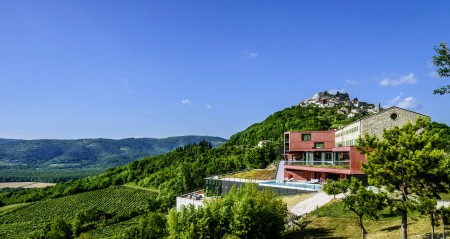 In the heart of the Istrian peninsula, directly below the medieval town of Motovun, this unique boutique and wine hotel is surrounded by extensive vineyards and oak forests, where the coveted white truffles thrive. From the infinity pool and the adjacent hotel terrace, you can enjoy a breathtaking view of the lush green Mirna Valley and the enchanting hilly landscape of Istria. The small but exquisite hotel also impresses with its superb cuisine and excellent wines. In addition to the elegant hotel, the historic building houses an ultra-modern, four-storey underground wine cellar. The wines of passionate winemaker Mladen Rožanić are made from indigenous and internationally recognized grape varieties according to the highest ecological standards and, with their unmistakable character, are among the top wines in Croatia. Enjoyment is the top priority at this boutique hotel.