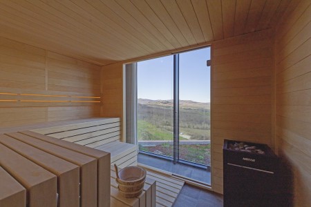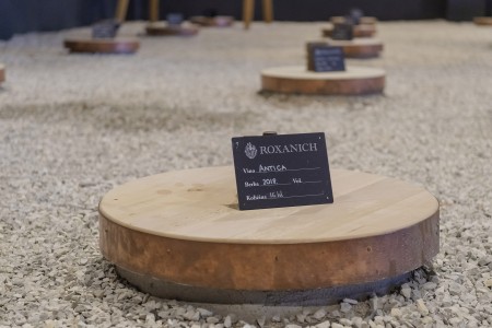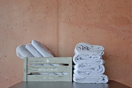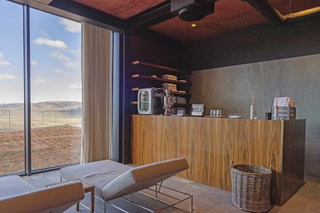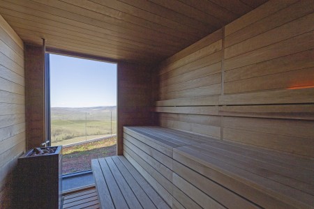 Rox Suite: approx. 50 m², luxurious and furnished with designer furniture, sleeping area with low double bed, living area with armchair and sofa bed, large shower cubicle in the bathroom, approx. 25 m² mirrored balcony with 180° view of the surrounding vineyards and the Mirna Valley.