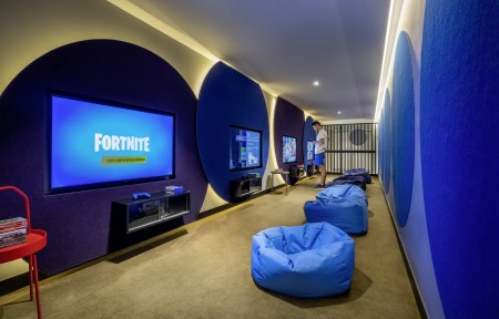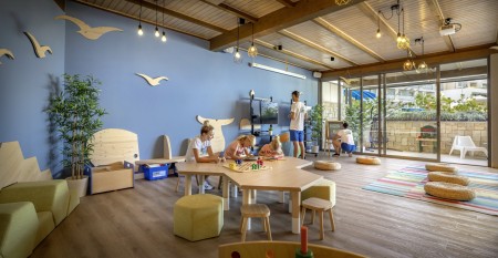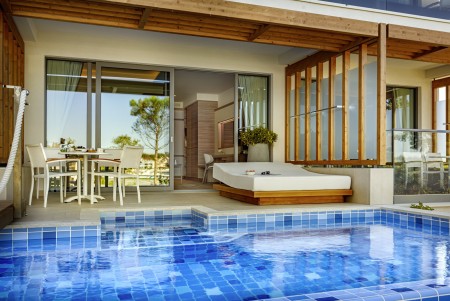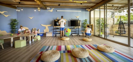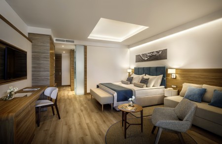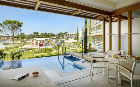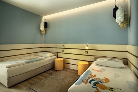 Family Suite Swim-up V-Level: approx. 40 m², bedroom with double bed, separate children's sleeping area with two sofas (separated by a sliding door), 2 LCD satellite TVs, bathroom with bathtub and shower, separate WC, terrace or balcony with seating, sea view and sun loungers as well as access to the swim-up pool.