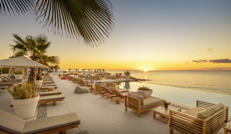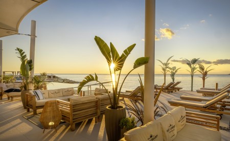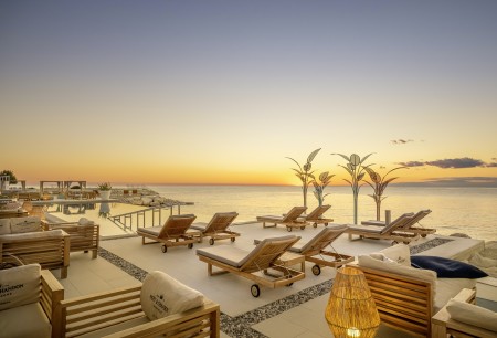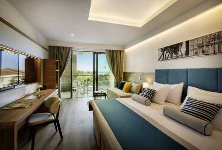 Family Suite V-Level: approx. 40 m², one bedroom with double bed, separate children's sleeping area with two sofas, bath/shower/WC, separate WC, balcony with seating and sun loungers, sea view.
