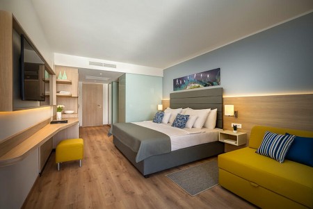 Junior Family Suite: approx. 28–32 m², one bedroom with a double bed or two single beds, living area with a double sofa bed (160x200 cm) and a desk, bathroom/toilet, balcony. Can be booked facing the park or the sea.