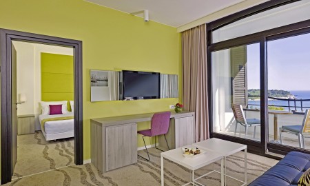 Facilities: Lobby with ATM and cozy sitting areas, lobby bar with terrace, Luna's Lounge Bar, chill-out terrace, restaurant, tavern, conference rooms, congress hall, hairdressing salon. Heated indoor seawater pool with pool bar, seawater swimming pool, sun terrace with parasols and sun loungers (included in the price, limited number). Animation program for children and adults from the beginning of June to mid-September. There is also a separate play area for children in the complex on approx. 220 m² inside and approx. 203 m² outside - Baby Corner (0-3 years) with toys for the youngest, Adventure Land (4-12 years) with climbing garden and pirate cave with slide, Teens Room (10-17 years) with games console, LCD TV and PC with WiFi internet (free of charge). Parking at the hotel, also garage for a fee (subject to availability, at the reception of the Park Plaza Verudela apartments). WiFi internet available throughout the hotel (free of charge). The shopping street "Verudela Avenue" with café, gallery, boutiques, restaurants, pizzeria, supermarket and souvenir store runs between the Park Plaza Verudela vacation complex and the Park Plaza Histria Hotel.