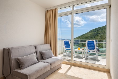 Family room standard: approx. 30 m², with additional sofa bed (140x190 cm) for two people and balcony facing the sea.